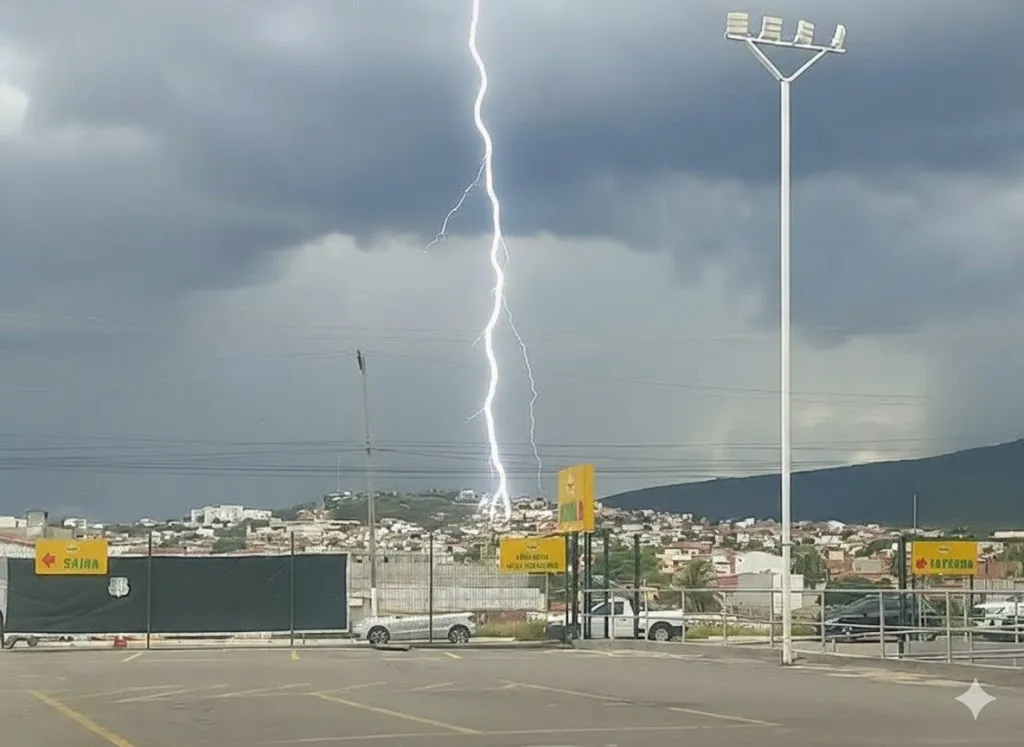Uma fotografia que circula nas redes sociais registrou o momento exato em que um raio em Brumado atinge a cerca metálica de um hipermercado na cidade, no interi...