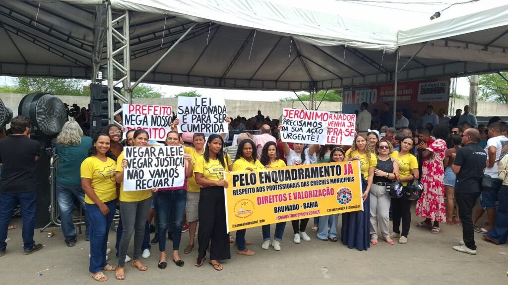 Impedidas por decisão liminar de realizar determinados atos de mobilização, cuidadoras de creche de Brumado adotaram uma estratégia alternativa e compareceram, no último dia 24 de abril, à inauguração da Unidade Básica de Saúde (UBS) José Clemente, durante o horário de almoço. No local, cobraram publicamente o cumprimento da Lei Federal nº 15.326/2026, que reconhece como indissociáveis as funções de cuidar e educar na educação infantil.