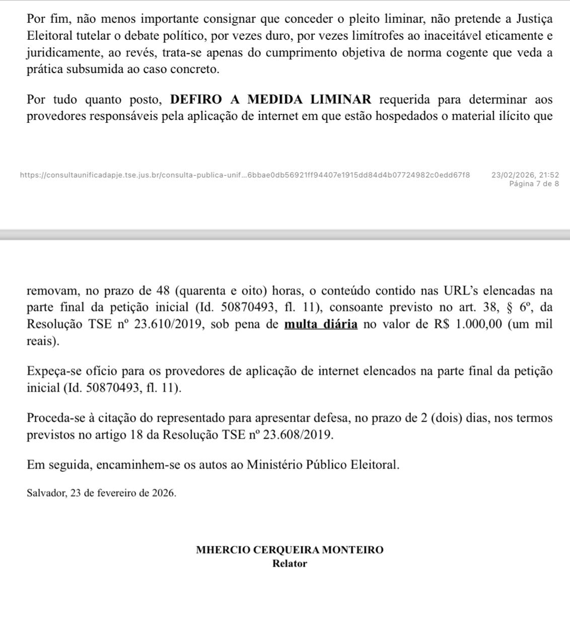 O TRE-BA determinou a remoção do conteúdo no prazo de 48 horas, sob pena de multa diária de R$ 1.000,00 em caso de descumprimento. A decisão é provisória e o mérito ainda será julgado após a manifestação das partes e do Ministério Público Eleitoral.